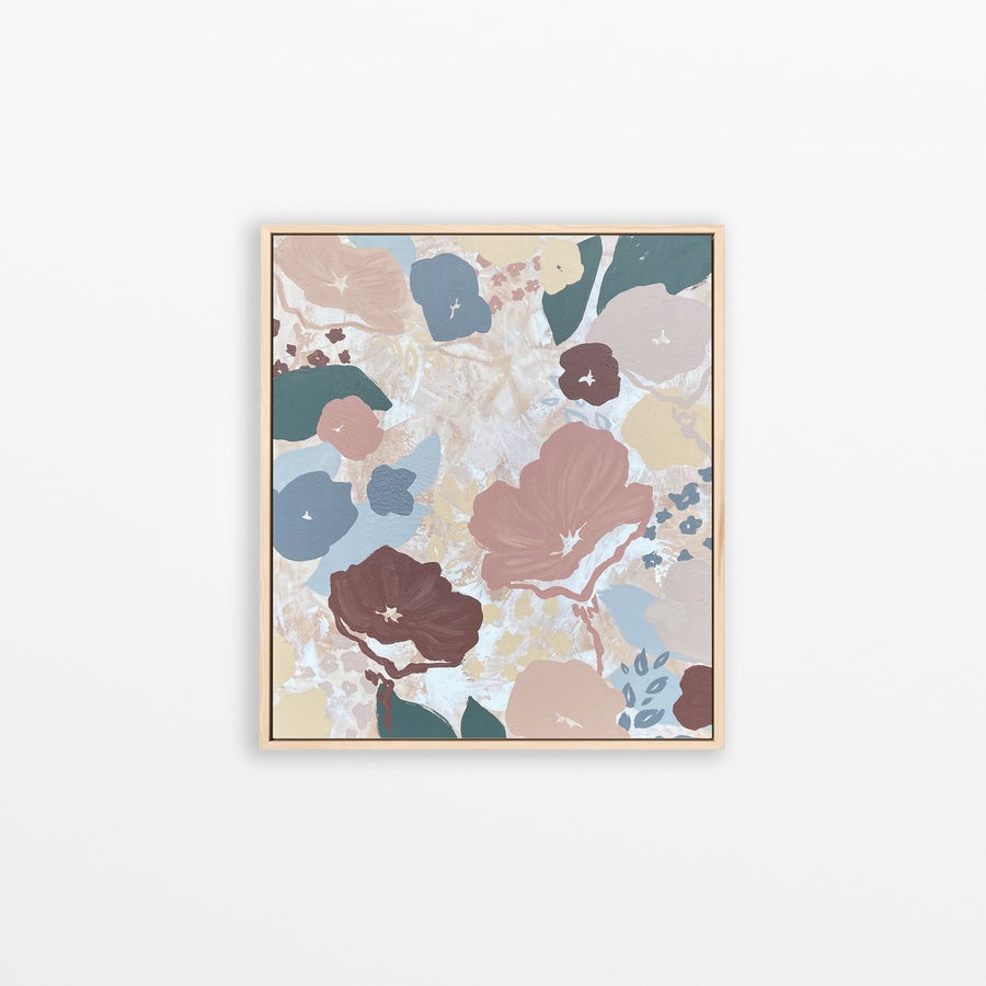This original painting brings a soft and serene mood. Dusty blues, gentle purples, and muted pinks come together in abstracted poppy forms. The background is my signature textured squeegee technique that reflects my textile design era.