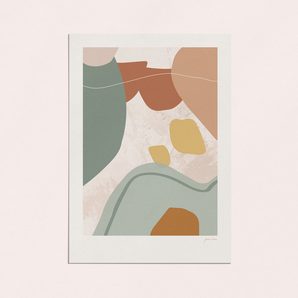 Cool blue tones are contrasted by warm rust and lemon yellow in this abstract composition.