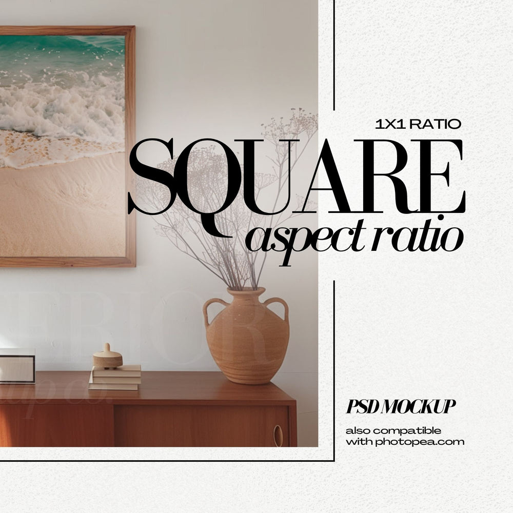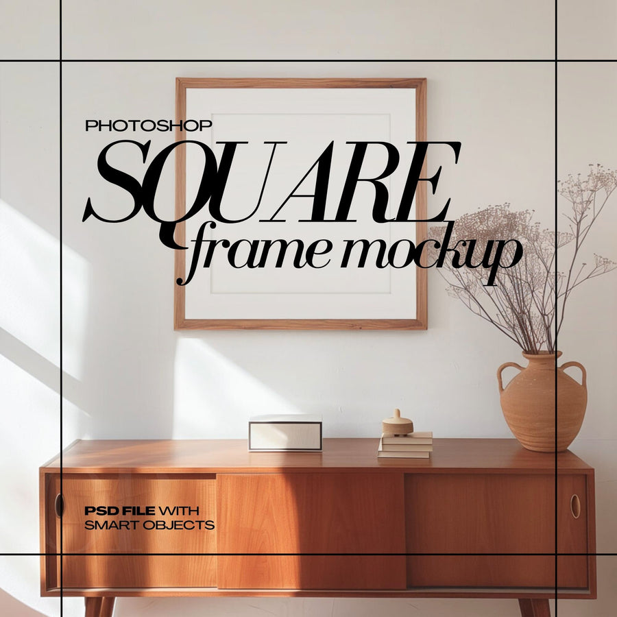 Mid Century Wood Frame Mockup PSD Square Wall Art Mockup Retro Furniture Interior