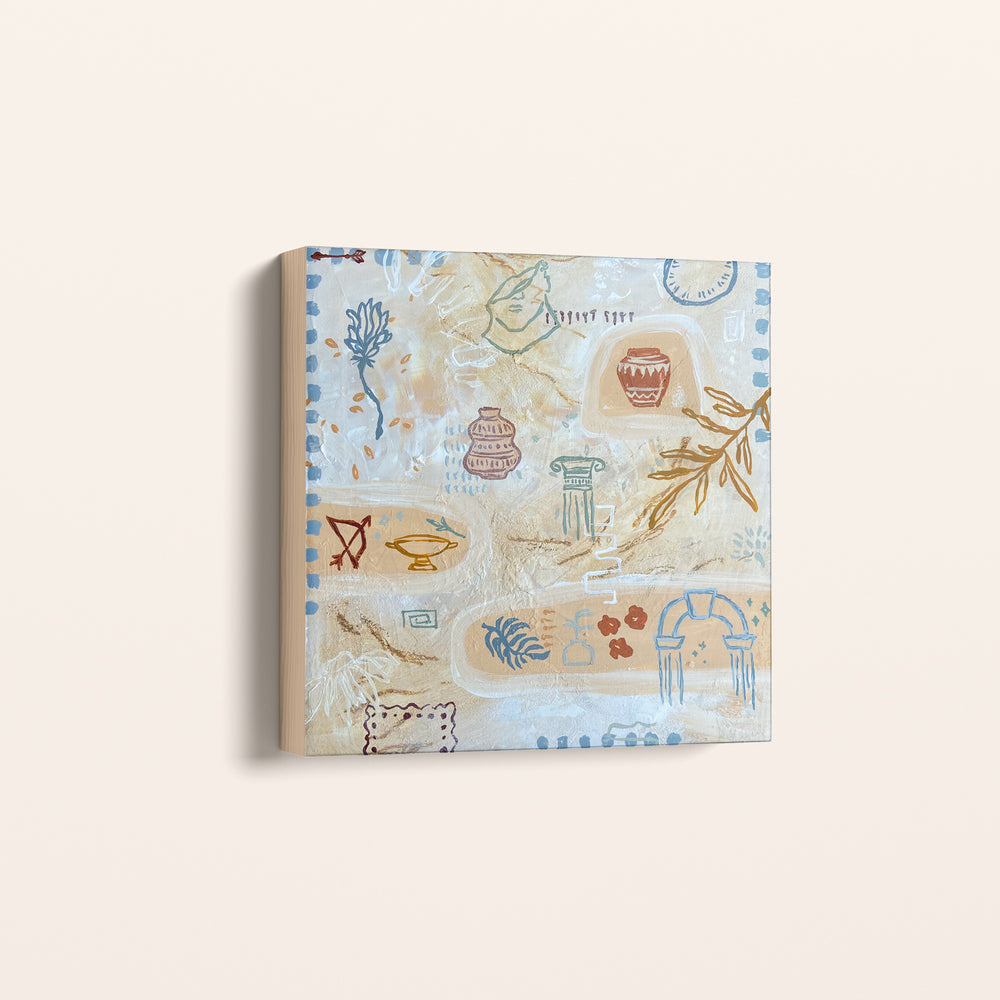 Welcome to my first foray into a new style of painting! "Citizen of the World" is inspired by Roman architecture. The unique blend of texture and colors create a show stopping piece. Through this piece I have embarked on an exploration of my intuitive style and experimented with additional mediums such as oil pastels and glazes.