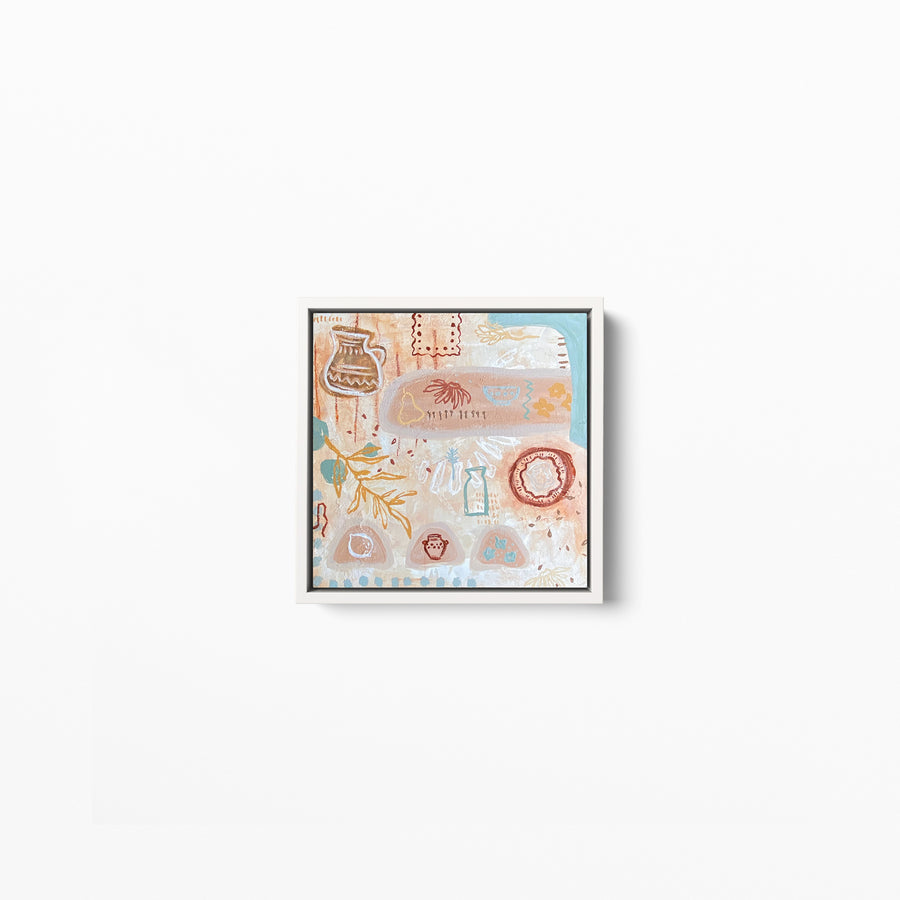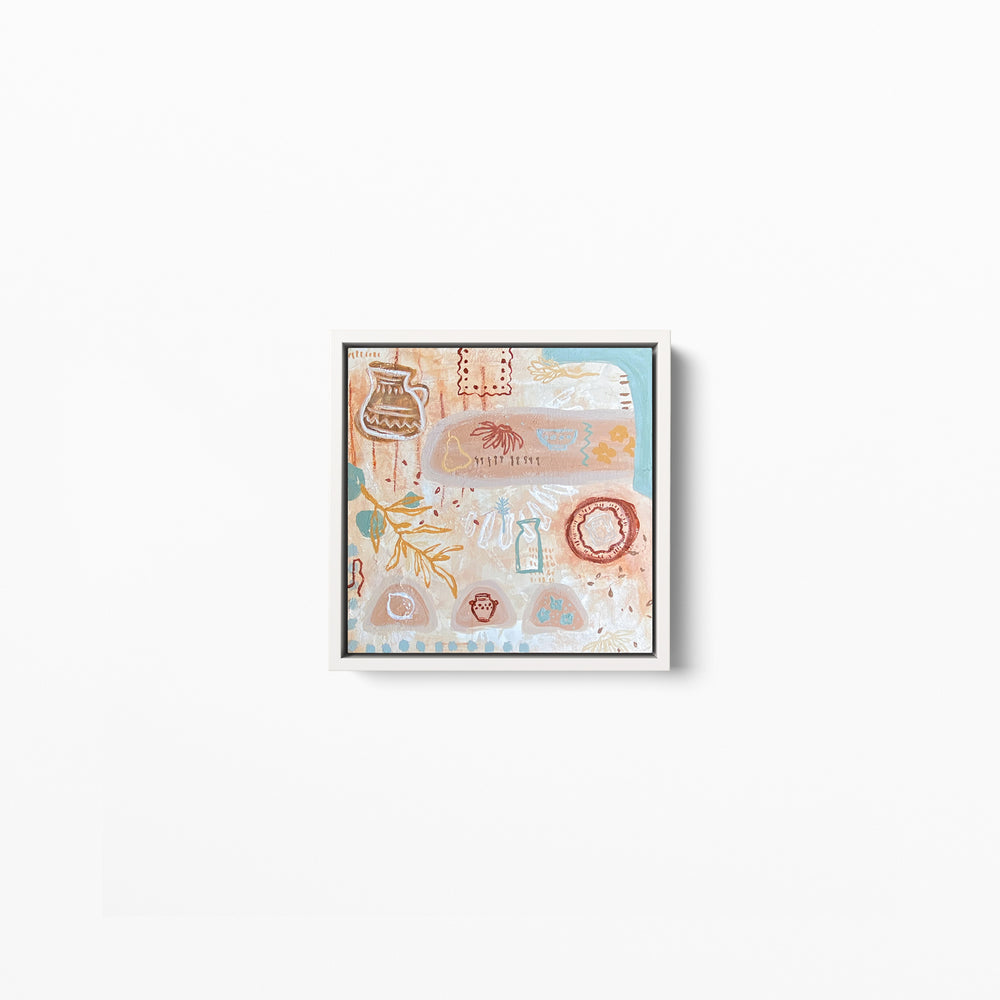 Tones are complimentary with cool pewter and rich terracotta being the stars of the show. Pops of ochre, leather brown and highlights of white pull the piece together.