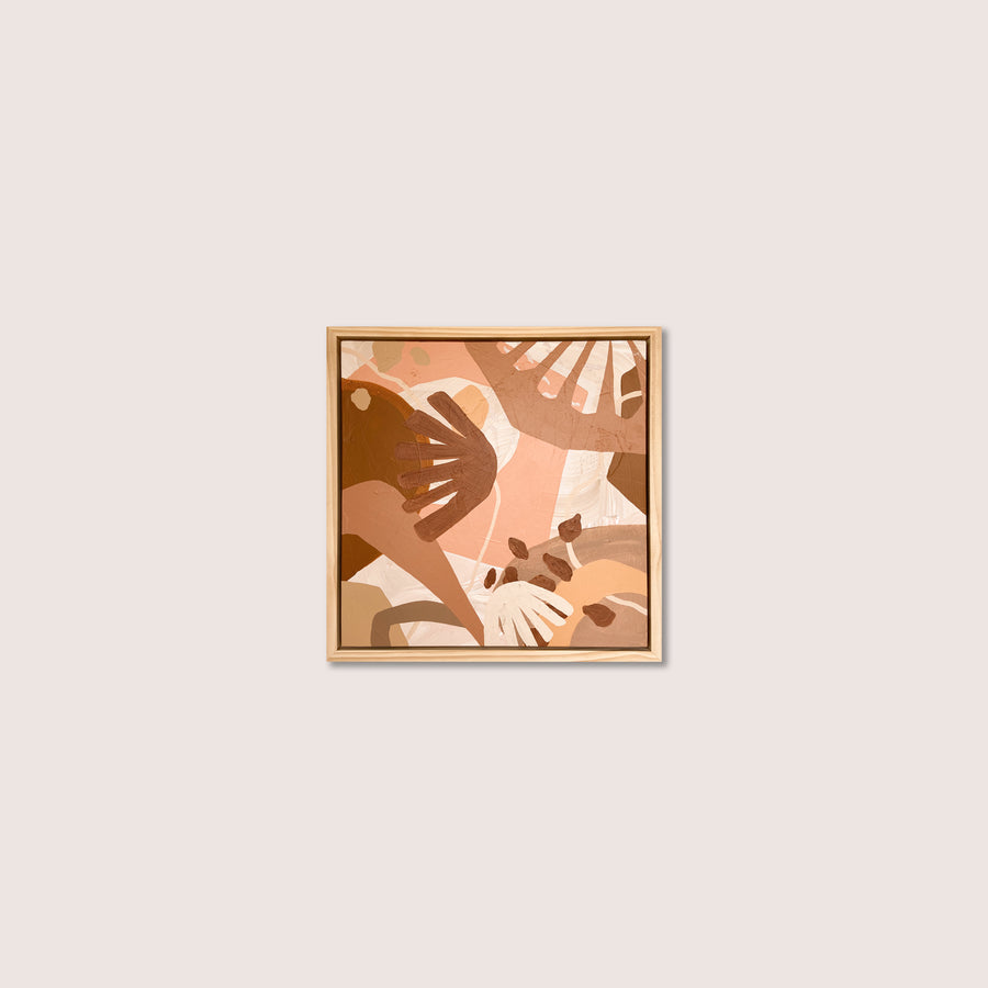 Inspired by my hand cut paper collage compositions, this original explores shape, scale and layering. The beautiful colour palette consists of pink terracotta, copper brown and orange bourbon. More of this series to come!